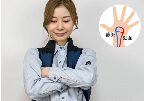 休憩中、空いた時間などにドライアイスジャケットの脇に手を入れることがお勧めです。