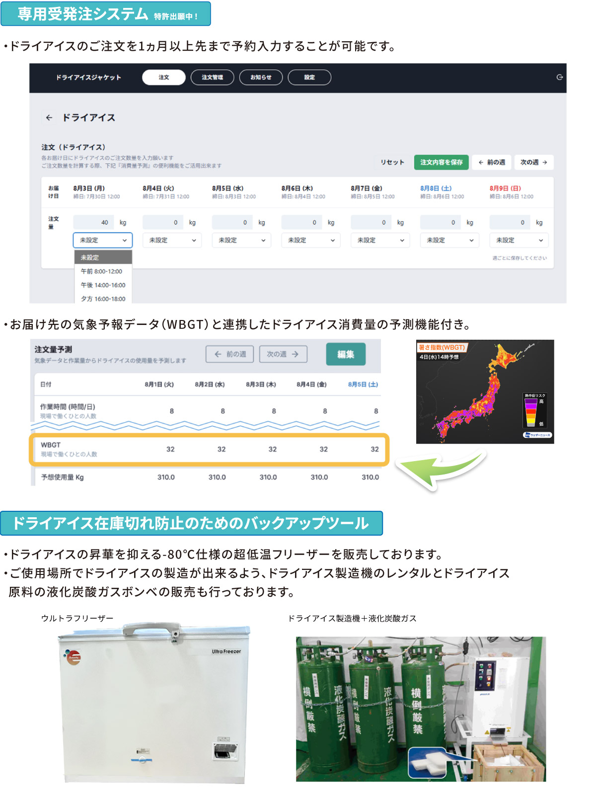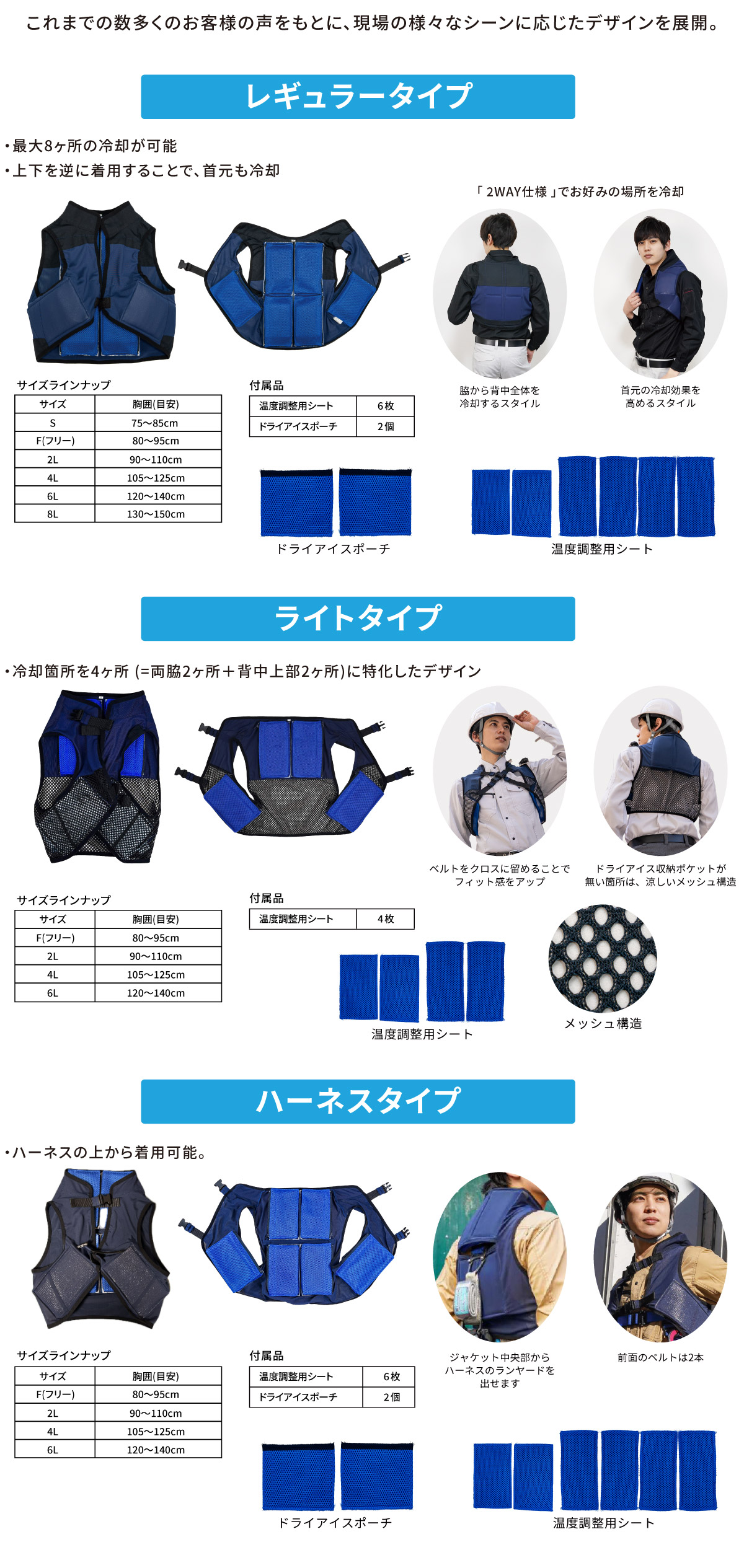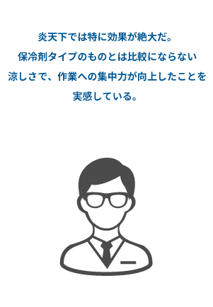 | 使用中の状況 | 保冷剤が結露し衣類がウェットに | 高温環境下では温風を吸い込む | 昇華するため衣類はドライ状態をキープ |